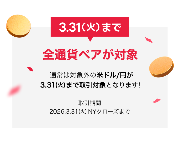 ⇒2026年3月31日(火)NYクローズまでの取引に関しては、米ドル/円も対象となります。 - ハンガリーフォリント/円の通貨ペアは、実際の取引量の100分の1を判定する際の取引量とします。