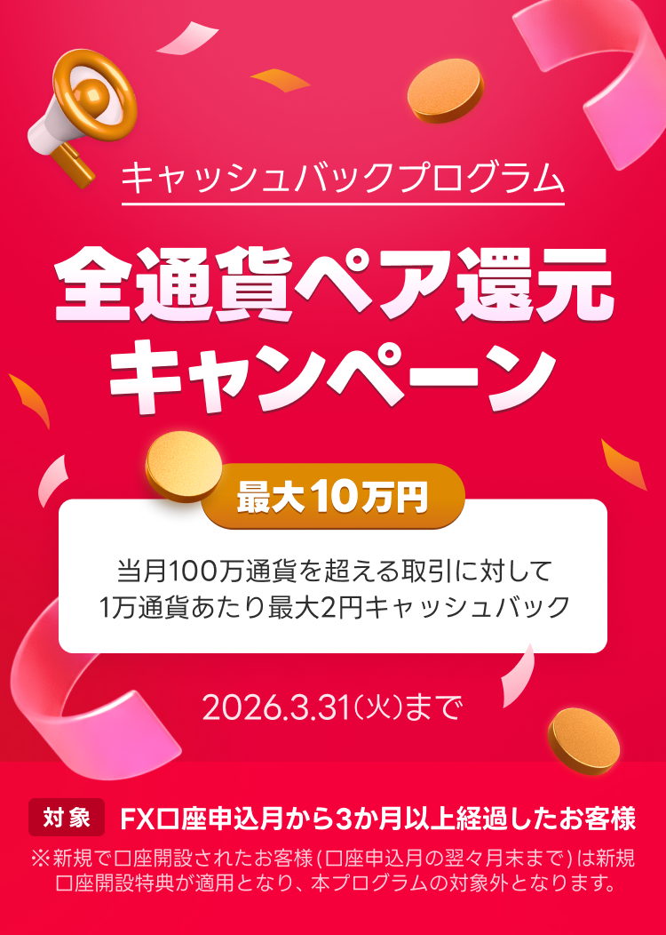 毎月の新規取引量に応じて、キャッシュバックいたします。通常、当月100万通貨を超える取引を行った場合、100万通貨を超えた取引量に対して1万通貨あたり1円を還元するところ、前月15日NYクローズ時点の現金残高50万円以上のお客様は、1万通貨あたり2円を還元します。
