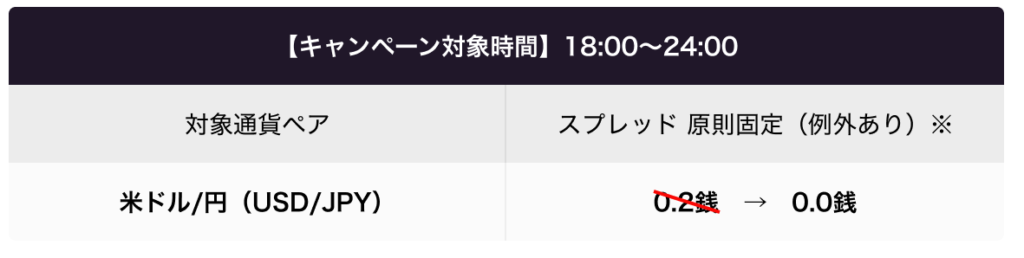キャンペーン期間中の18:00~24:00の時間帯は「米ドル/円(USD/JPY)」の原則固定(例外あり)スプレッドを「ゼロ(0.0銭)」にてご提供いたします。
