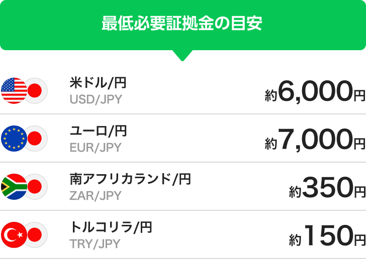 ※各通貨ペアで取引を始めるために必要な最低証拠金の目安です。証拠金維持率が100%未満になった場合、ロスカットが執行されますので、余裕を持ったご入金をお願いいたします。