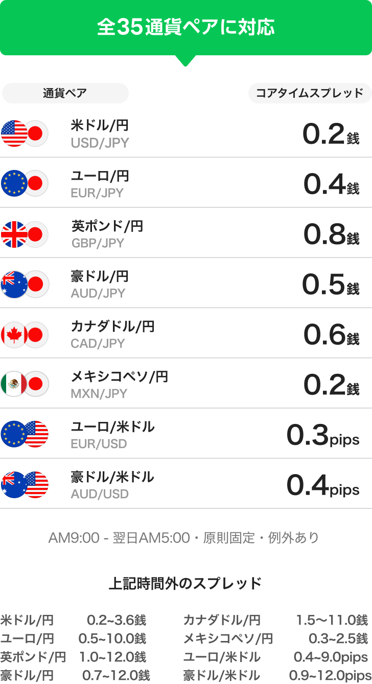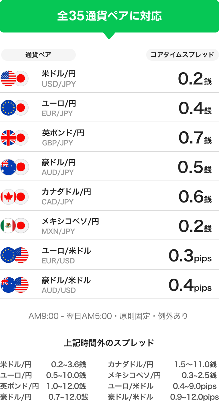 - コアタイムスプレッドは各営業日「AM9:00 – 翌日AM5:00」の時間帯で提供(例外あり)。 市場の急変時(震災などの天変地異・各国中央銀行の市場介入・その他外部要因)、 市場の流動性が低下している状況(米国東部時間午後5時前後・年末年始・クリスマス時期など)や重要指標発表時間帯などにより、 スプレッドが拡大する場合があります。