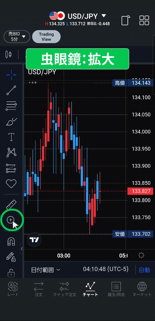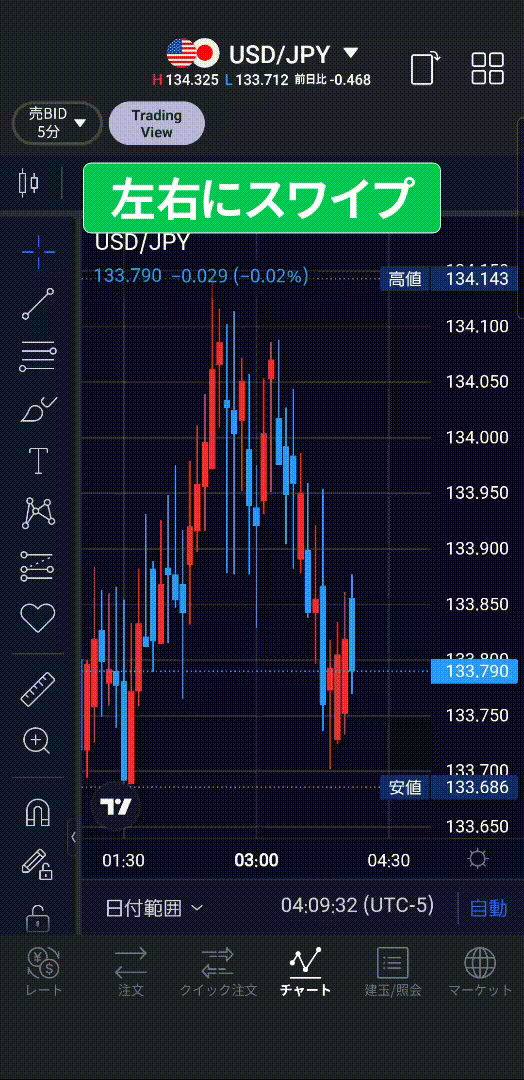 高機能チャートで見える範囲を調整したいときは、画面を左右にスワイプ(画面上で指を滑らせる)しましょう。