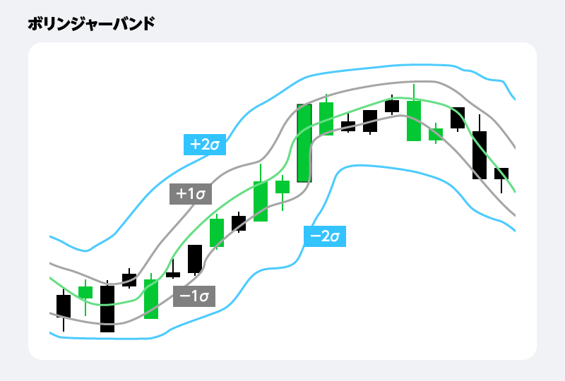 ボリンジャーバンドは、移動平均を表す線とその上下に値動きの幅を示す線を加えた指標で、相場がこの範囲に収まるという統計学を応用したテクニカル指標の1つです。標準偏差1の範囲に価格の値動きが収まる確率が約68%、標準偏差値の範囲の2倍までの範囲に収まる確率が95%とされていて、確率から相場を分析します。