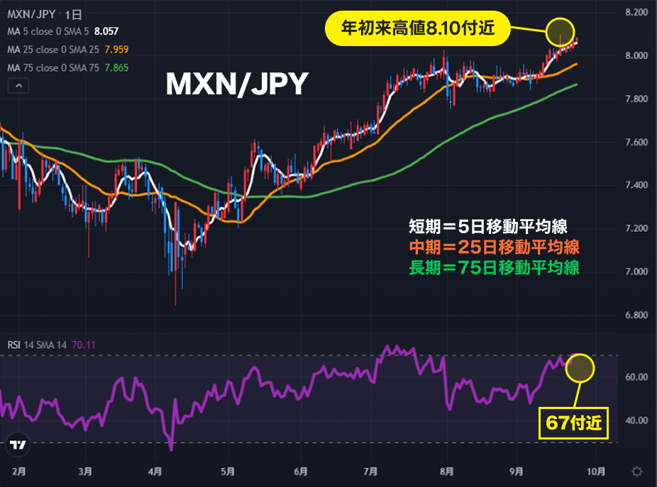 9月に入り、8月の年初来高値を更新し、高値圏での推移が続くMXN/JPY。移動平均線※1の短期(5日)、中期(25日)、長期(75日)がいずれも上向きで、買いのパーフェクトオーダー※2を形成中であり、足元はトレンドフォロー型の買い戦略が優位という見方も。一方、RSIは過熱感を示す70の水準が近づいており、短期的な調整局面には注意が必要となる。
