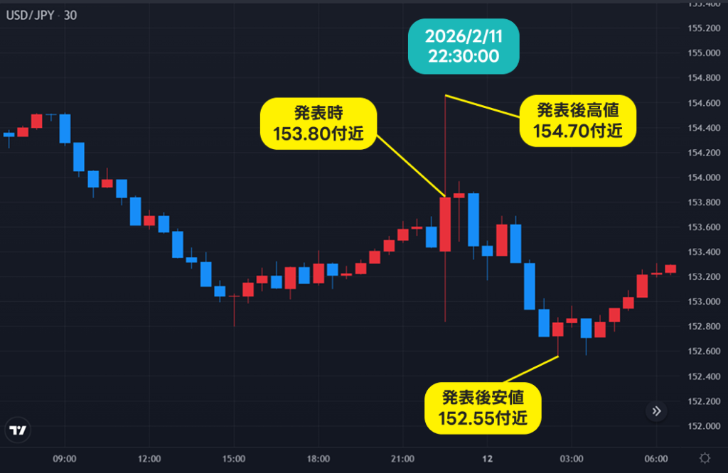 2月11日(水)に発表された前回の米国雇用統計。非農業部門雇用者数は市場予想を大幅に上回り、失業率も前月から低下したことから、足元の米国の労働市場の持ち直しを示す結果に。この予想外につよい内容を受け、FRBの利下げ観測は後退。発表後のUSD/JPYは乱高下し、発表直後は一時154.70円付近まで急伸した後、徐々に上値を切り下げ152円台まで下落し、153円台前半で取引を終了した。