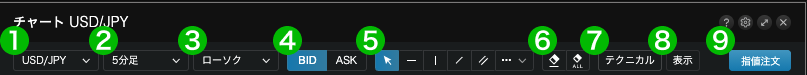 チャートでは、トレンドライン等の描画機能や、各種テクニカル指標でテクニカル分析が行える他、注文の発注や注文・保有建玉の表示等、様々な機能がご利用いただけます。